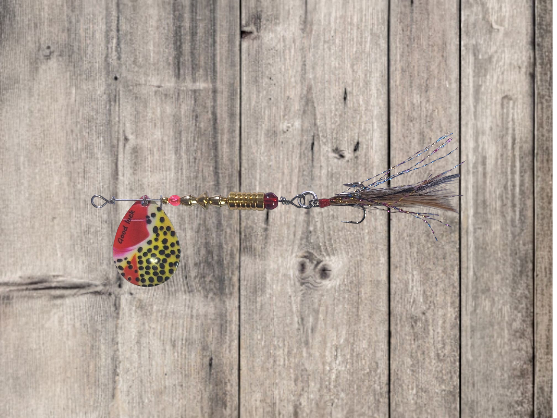 #4 Brass French Blade Spinner Yellow and Red with Black dots